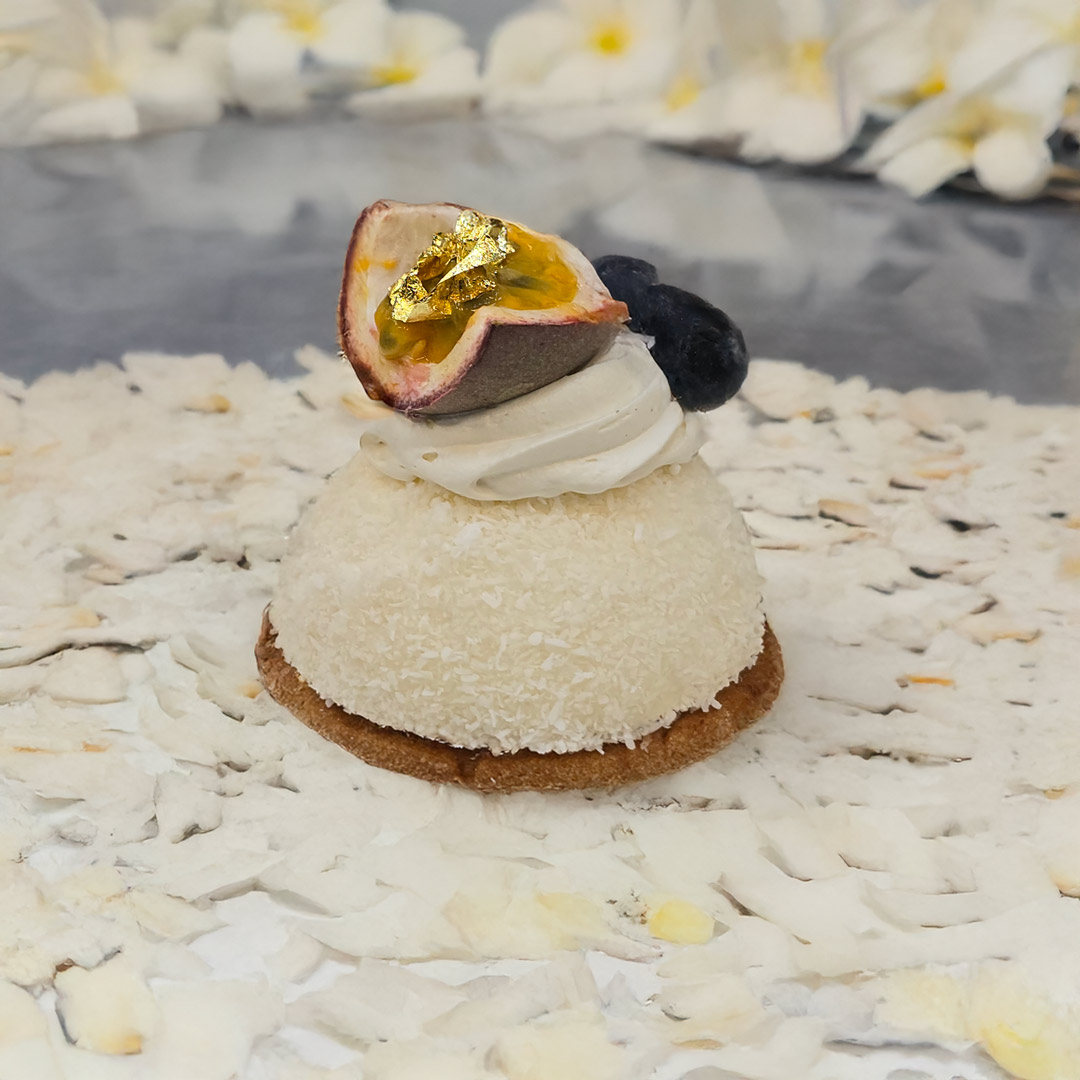 Une mousse fruit de la passion sur biscuit léger, nappée d’un glaçage miroir, offrant une explosion de saveurs exotiques.
