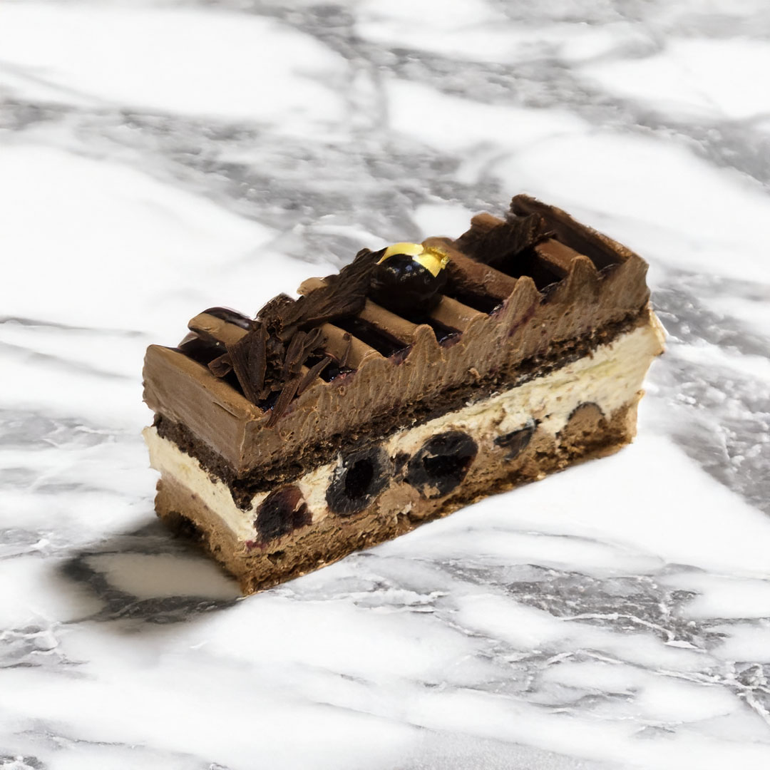 Alliance classique de chocolat intense et de cerises amarena, sublimée par des couches fondantes et équilibrées. Un grand classique revisité avec élégance.