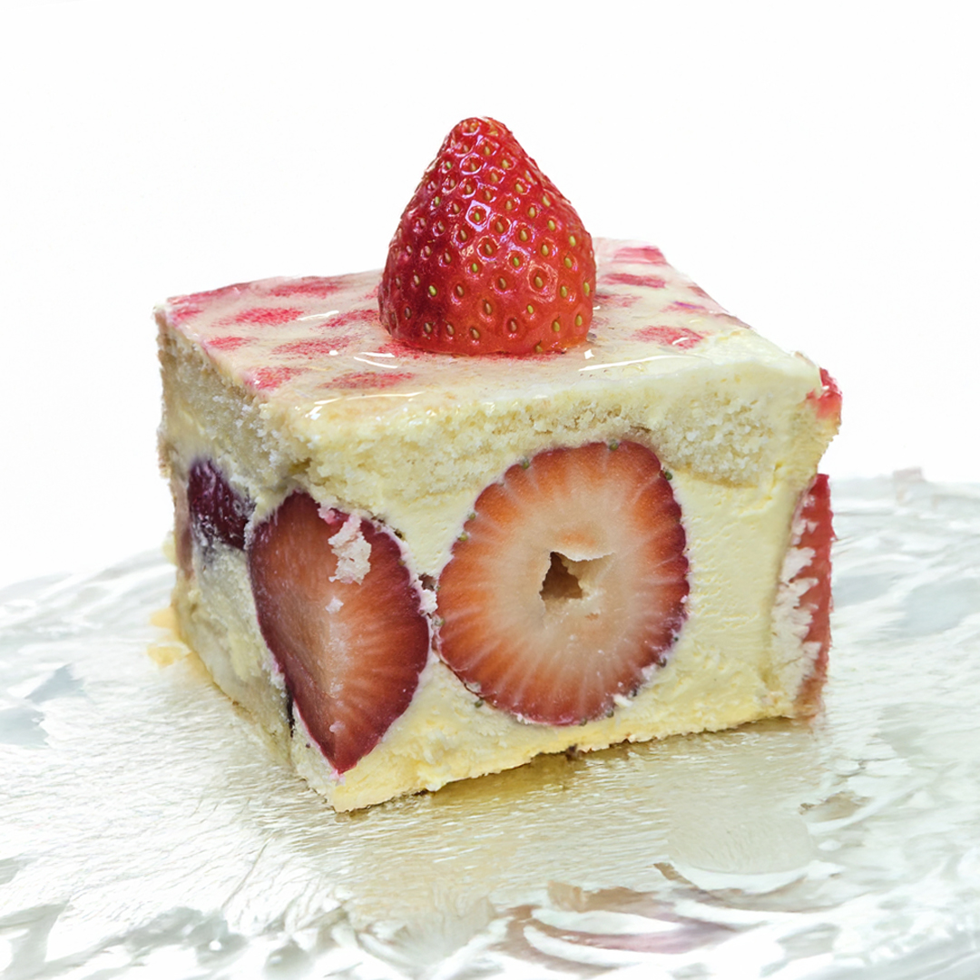 Génoise moelleuse, crème mousseline et fraises fraîches, le tout recouvert d’une fine couche de pâte d’amande