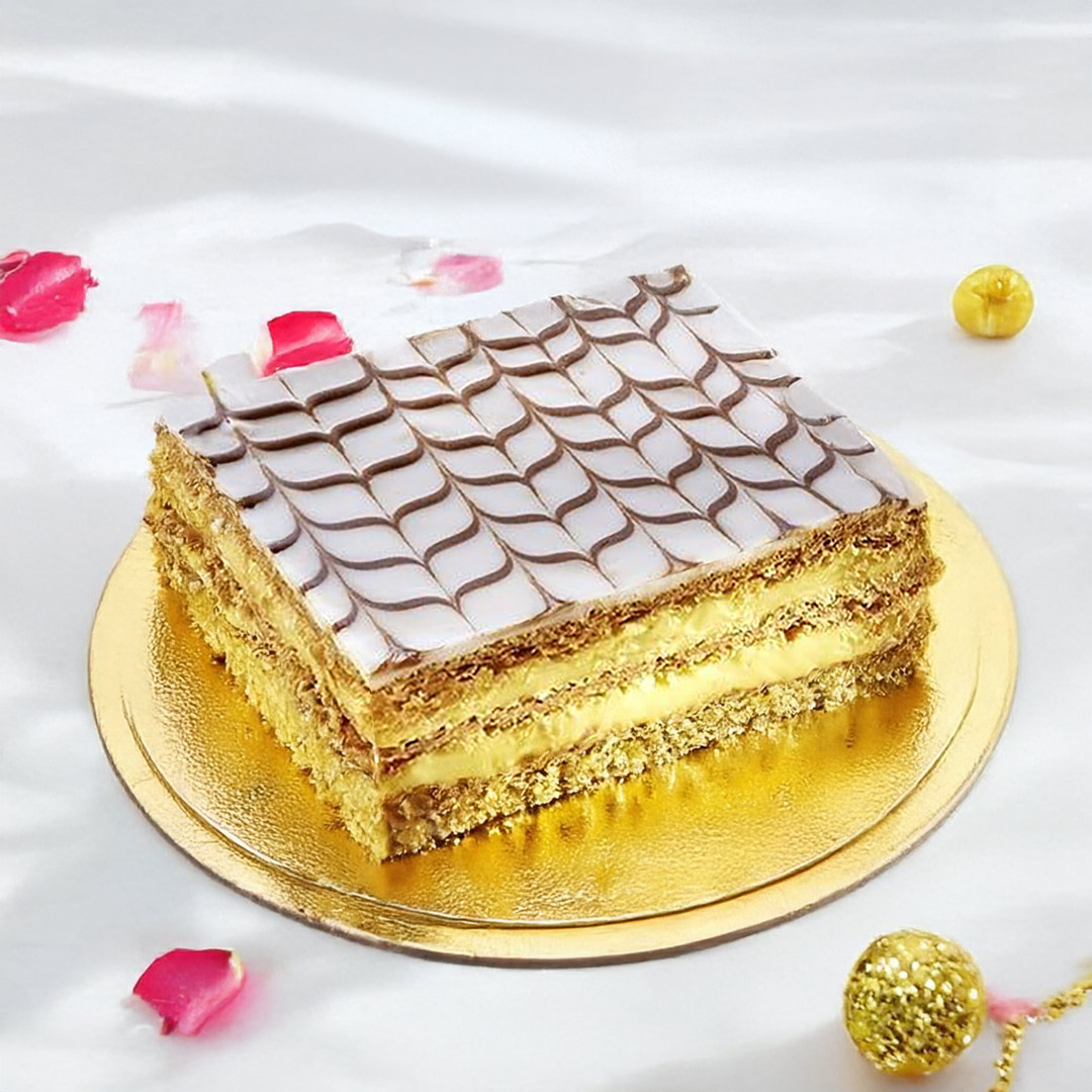 Découvrez notre mille-feuille revisité façon entremets : de fines couches croustillantes de pâte feuilletée caramélisée alternées avec une crème pâtissière vanille délicatement parfumée. Le tout est sublimé par un élégant fondant marbré, pour un plaisir gourmand aussi raffiné que généreux.