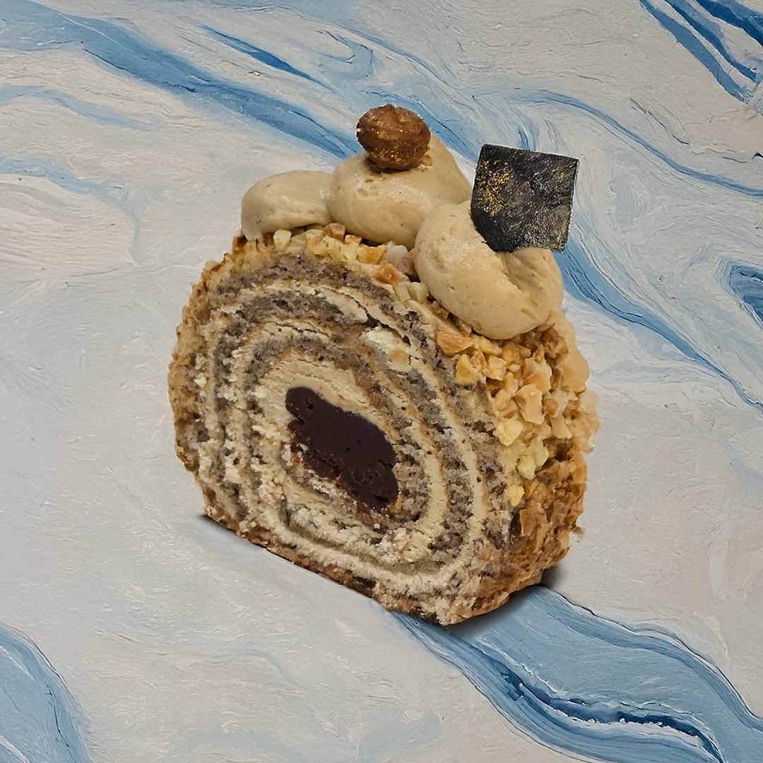 Biscuit roulé autour d’une crème au chocolat praliné, offrant un mélange de saveurs douces et croquantes.